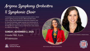 Symphonic Choir and Arizona Symphony Orchestra team up for a dynamic and varied program of works by a wide range of contemporary and historical composers. DMA student María Fátima Corona del Toro will lead the orchestra in a performance of Felix Mendelssohn’s powerful Symphony No. 5, nicknamed the Reformation Symphony. Conducted by Dr. Elizabeth Schauer, the combined ensembles will present a composite mass featuring music from around the globe and from multiple faith traditions, by composers including Damien Geter, Mary Lou Williams, José Mauricio Nunes Garcia, Marianna Martines, and others. Concert guests also will have the opportunity to purchase Symphonic Choir’s newly released CD recording of their 2024 performance of Marianna Martines’s Terza Messa.