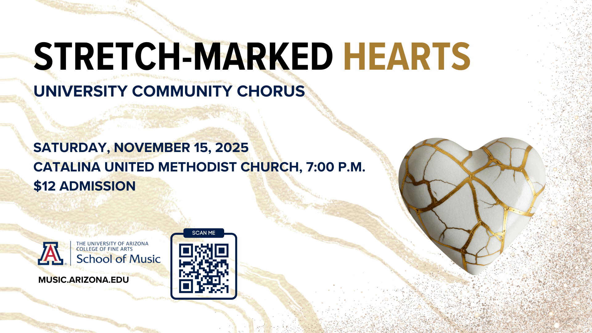 Inspired by the life and legacy of poet Andrea Gibson, who wrote, “In the end, I want my heart to be covered in stretch marks,”—this concert is a meditation on how love shapes us. Through music that is tender, fierce, and deeply human, the University Community Chorus reflects on the ways love grows beyond its borders: how it expands us, unsettles us, leaves its mark, and calls us into courage. Featuring Considering Matthew Shepard: A Choral Suite, this program offers space for grief, hope, transformation, and the enduring beauty of a heart stretched wide.